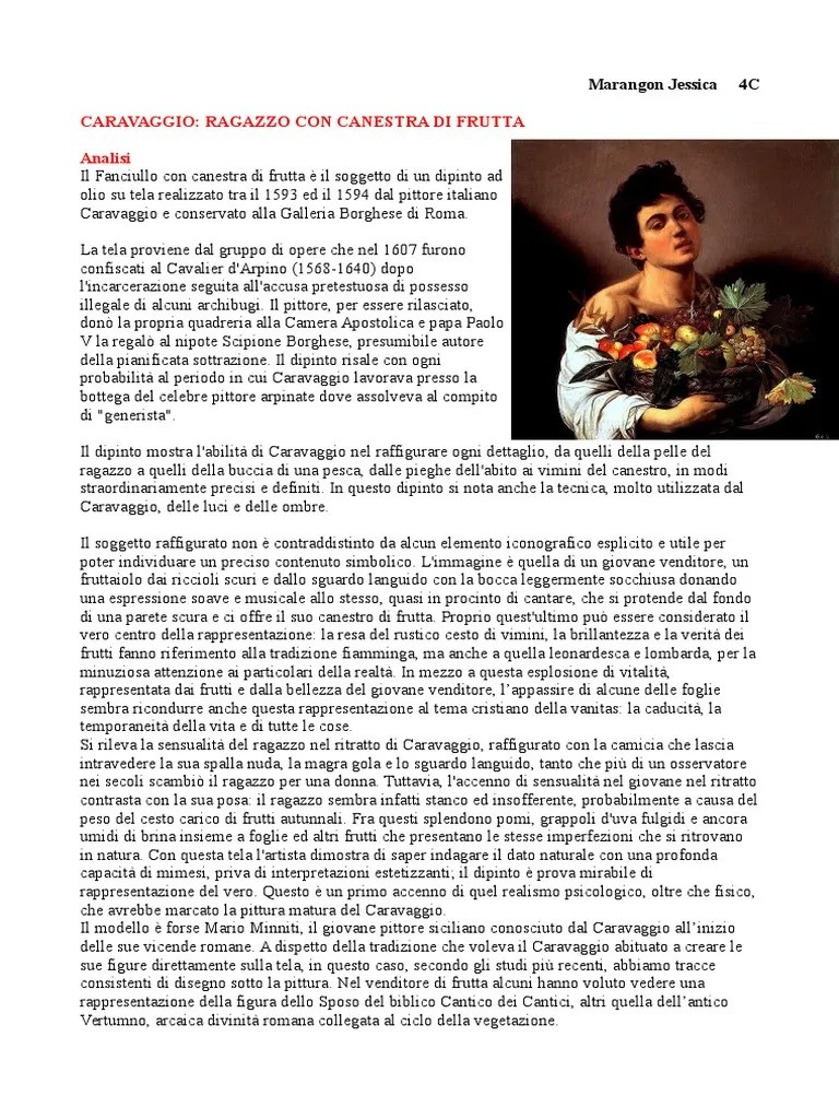 Solo nella " canestra di frutta" , invece, il cesto, i frutti e le foglie in parte rinsecchite diventano le uniche protagoniste dell'opera, non più dipendenti dalla presenza umana... Con uno sguardo d'insieme, coglieremo facilmente la vigorosa plasticità di tutta l'immagine, che l'artista ha voluto rendere ancora più vera, utilizzando uno sfondo uniforme e facendo sporgere appena il canestro dalla superficie del tavolo, in modo da... Seppur i titoli possono sembrarti simili, si tratta di due opere completamente differenti.